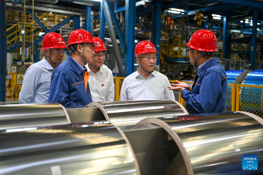 Chinese Vice Premier Zhang Guoqing, also a member of the Political Bureau of the Communist Party of China Central Committee, learns about the research and development of key materials in high-end manufacturing industry at a stainless steel company in Taiyuan, north China's Shanxi Province, June 22, 2025. Zhang called for efforts to promote the high-quality development of the manufacturing industry and continuously strengthen workplace safety during an inspection tour in north China's Shanxi Province which began on Sunday and ended on Tuesday. (Xinhua/Yang Chenguang)