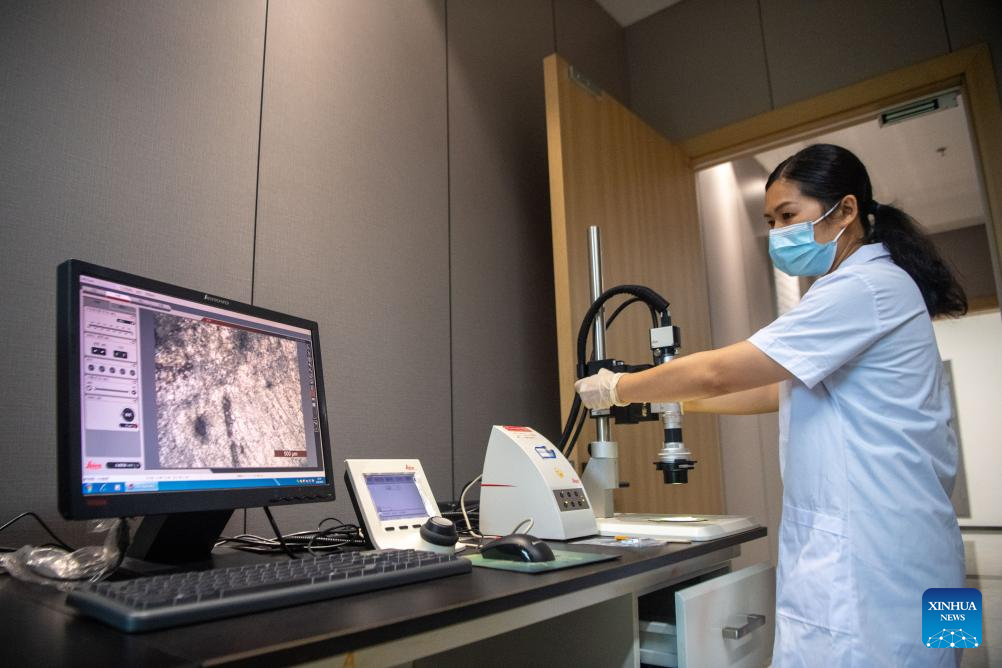 A staff member restores a relic and collects digital data from it at the Dazu Rock Carvings studio for relics restoration in southwest China's Chongqing Municipality, June 24, 2025. Dazu Rock Carvings, a UNESCO World Heritage Site in southwest China's Chongqing Municipality, is being injected with new vigor as various digital technologies are used for its protection and utilization.