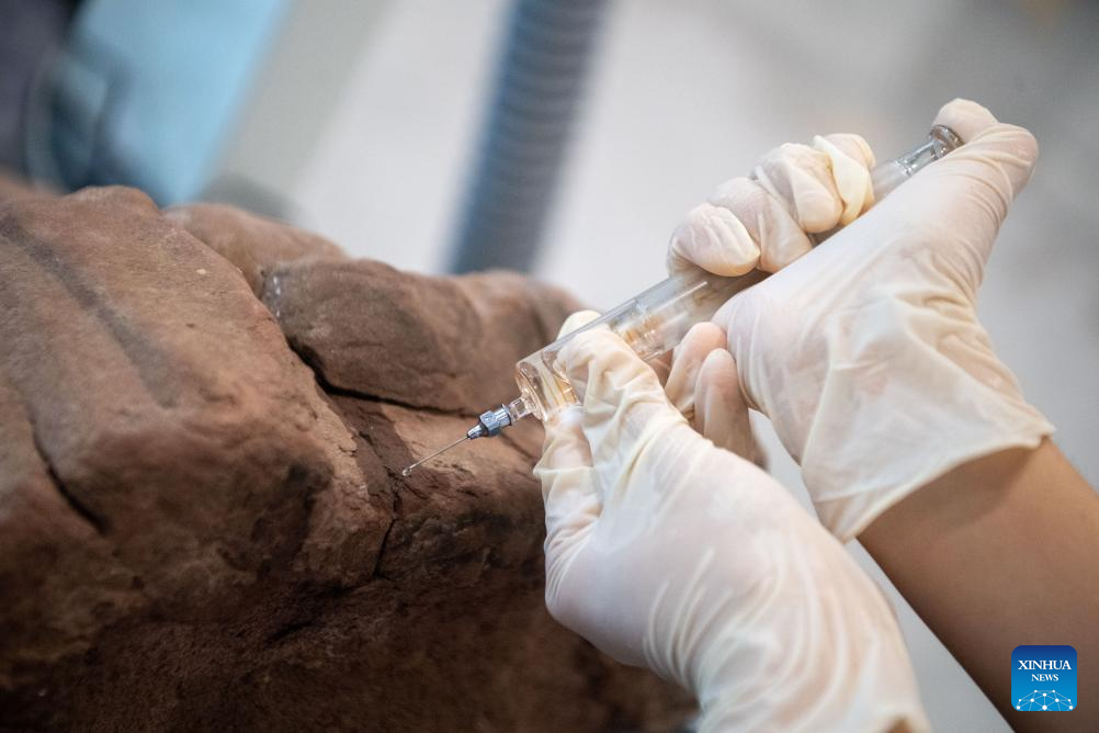 A staff member restores a rock-made relic at the Dazu Rock Carvings studio for relics restoration in southwest China's Chongqing Municipality, June 24, 2025. Dazu Rock Carvings, a UNESCO World Heritage Site in southwest China's Chongqing Municipality, is being injected with new vigor as various digital technologies are used for its protection and utilization.