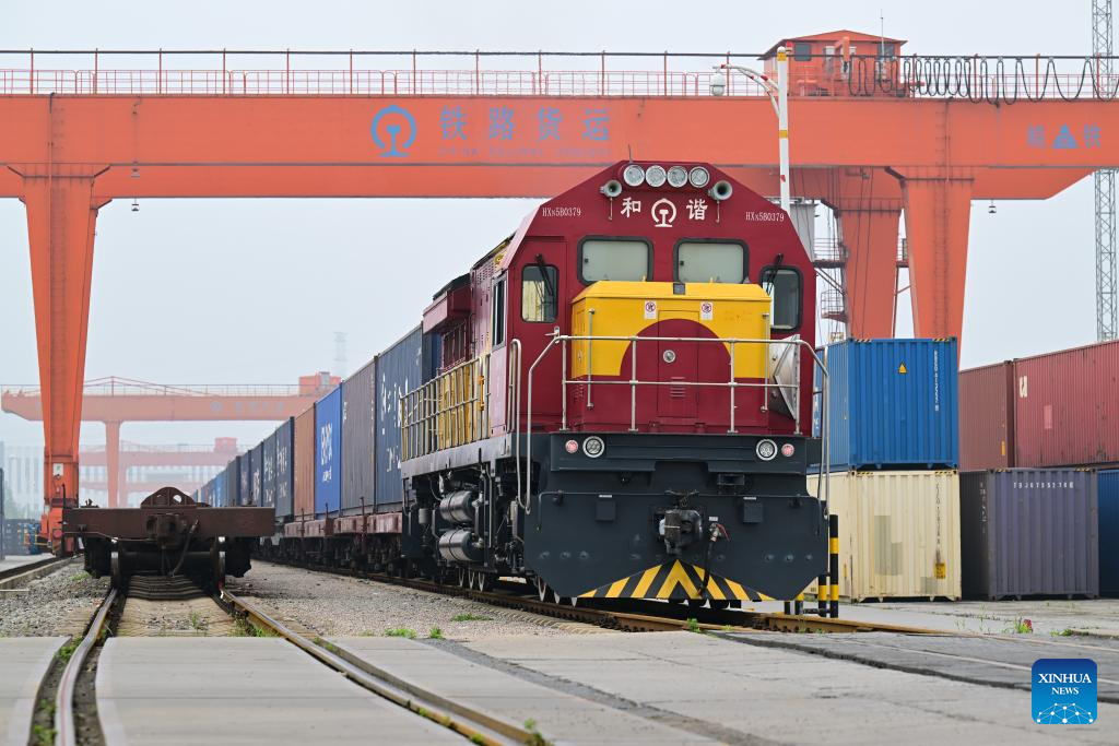 This photo shows a China-Europe freight train departing from a logistics center of Hefei north railway station in Hefei, east China's Anhui Province, June 13, 2025. Anhui Province takes advantage of convenient transportation infrastructure such as railway freight stations and ports along the Yangtze River to vigorously promote logistics development and local consumption. (Xinhua/Zhou Mu)