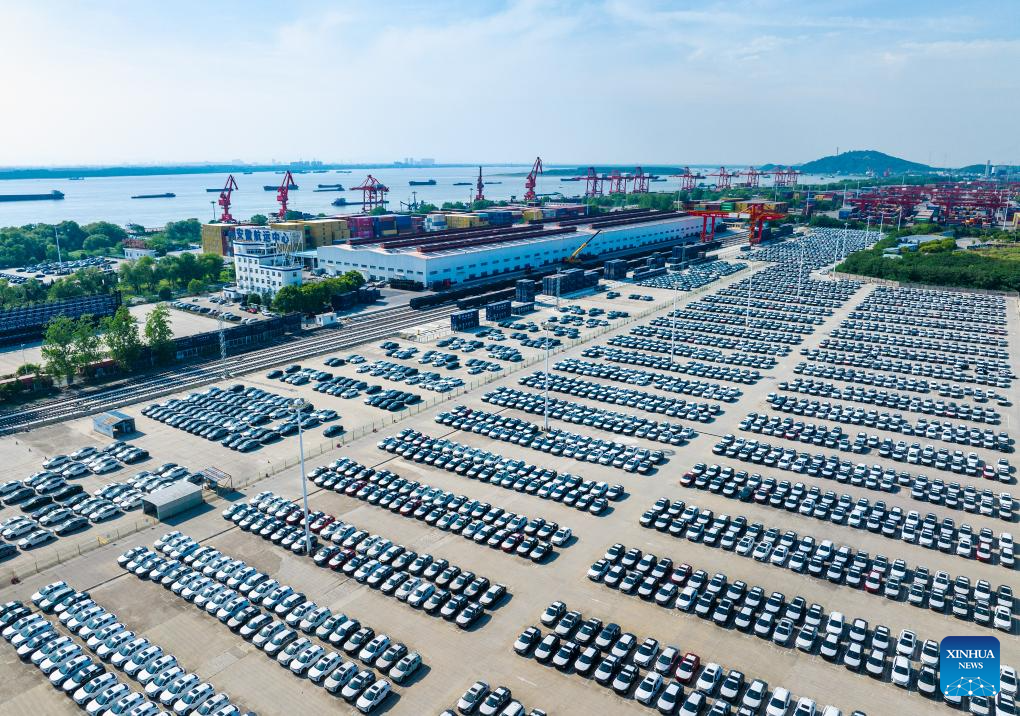 An aerial drone photo shows cars to be loaded for export at Zhujiaqiao area of Wuhu Port in Wuhu City, east China's Anhui Province, May 14, 2025. Anhui Province takes advantage of convenient transportation infrastructure such as railway freight stations and ports along the Yangtze River to vigorously promote logistics development and local consumption. (Photo by Xiao Benxiang/Xinhua)