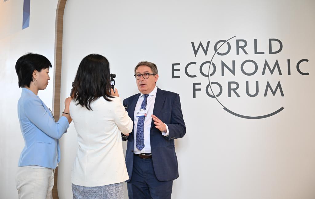 A guest receives an interview after the opening plenary of the Summer Davos at the National Convention and Exhibition Center (Tianjin) in north China's Tianjin Municipality, June 25, 2025. (Xinhua/Sun Fanyue)