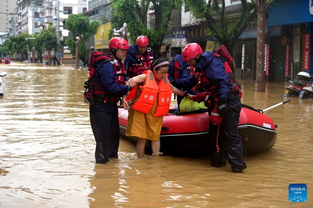 Rescuers evacuate residents from flood-affected area in Rongjiang County, southwest China's Guizhou Province, June 24, 2025. Continuous heavy rainfall and upstream inflows have triggered severe flooding in two counties of Guizhou Province in southwest China, prompting mass evacuations.