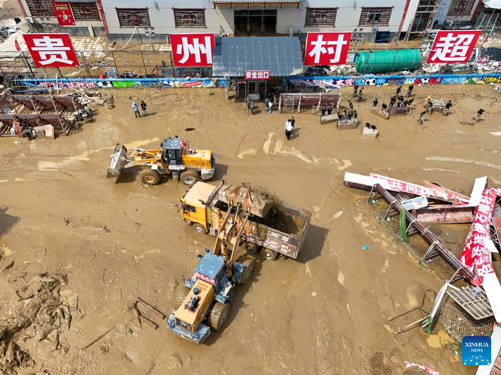 People clear silt on the road in Congjiang County, southwest China's Guizhou Province, June 25, 2025. Continuous heavy rainfall and upstream inflows have triggered severe flooding in two counties of Guizhou Province in southwest China, prompting mass evacuations.