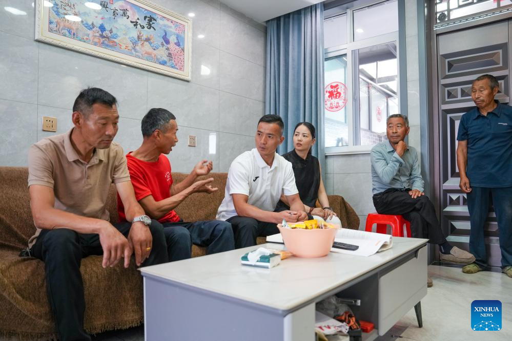 Dai Hu (L) visits a villager in Hanchen Village of Lianshui County in Huai'an City, east China's Jiangsu Province, June 23, 2025. (Xinhua/Li Bo)