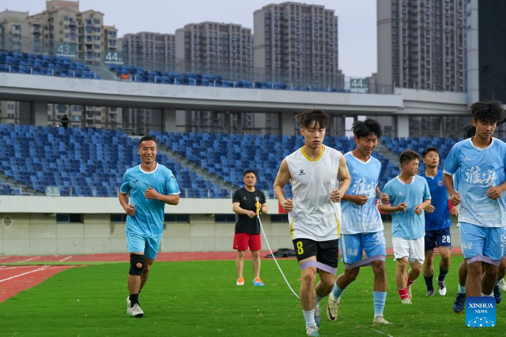 Dai Hu (1st L) warms up with teammates of Huai'an Team during a football training session in the stadium of Huai'an Olympic Center in Huai'an City, east China's Jiangsu Province, June 23, 2025. (Xinhua/Li Bo)