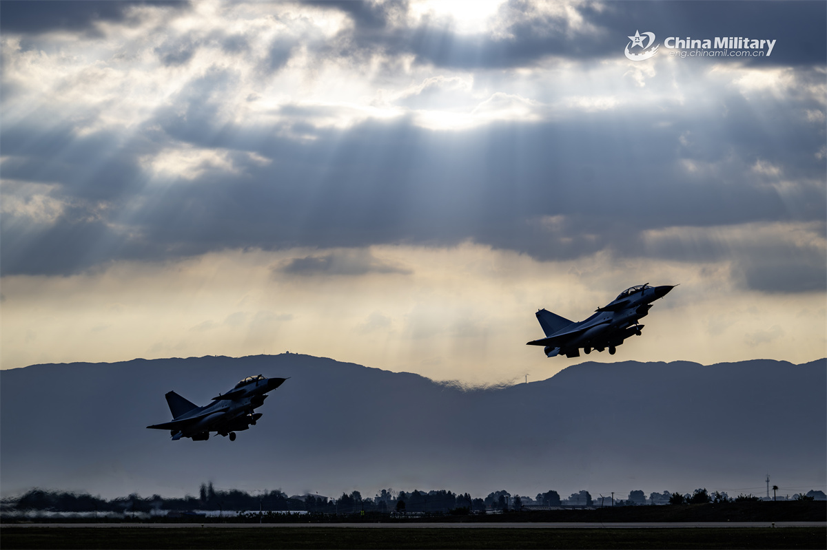 J-10 fighter jets attached to a unit under the Chinese PLA Air Force take off in succession during a recent flight training exercise. (eng.chinamil.com.cn/Photo by Xiao Rui)