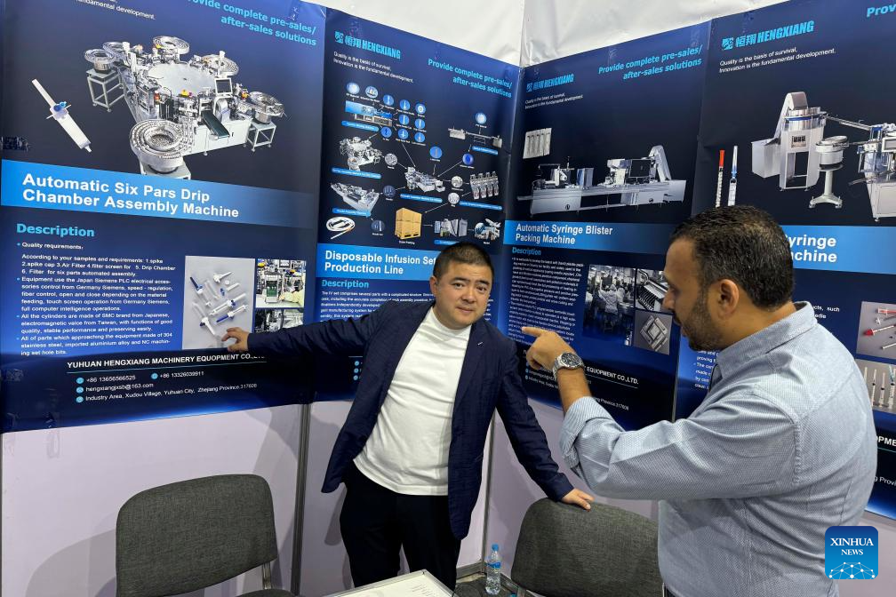 A visitor talks with an exhibitor at the booth of Chinese pharmaceutical and medical device companies during the fourth Africa Health ExCon in Cairo, Egypt, on June 26, 2025. Dozens of Chinese pharmaceutical and medical device companies are participating in the fourth Africa Health ExCon in Cairo, aiming to expand their presence in Egypt and tap into Africa's growing healthcare market. (Xinhua/Ahmed Gomaa)