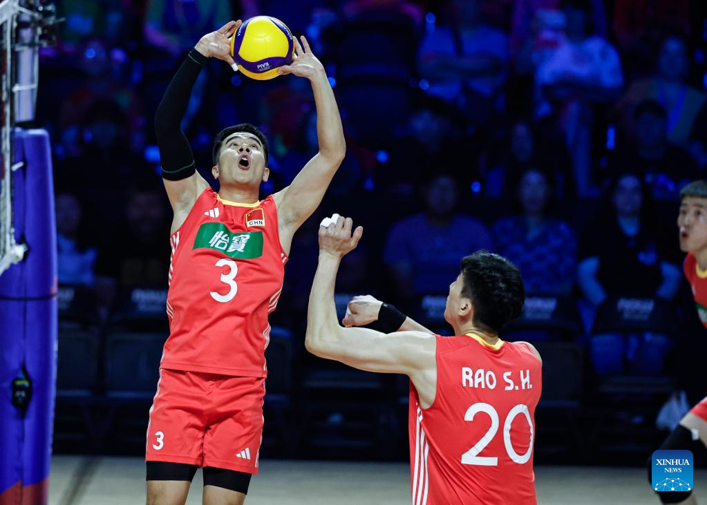 Wang Hebin (R) of China sets the ball during the Pool 5 match between China and Brazil at the Men's Volleyball Nations League (VNL) 2025 in Chicago, the United States, June 26, 2025. (Photo by Joel Lerner/Xinhua)