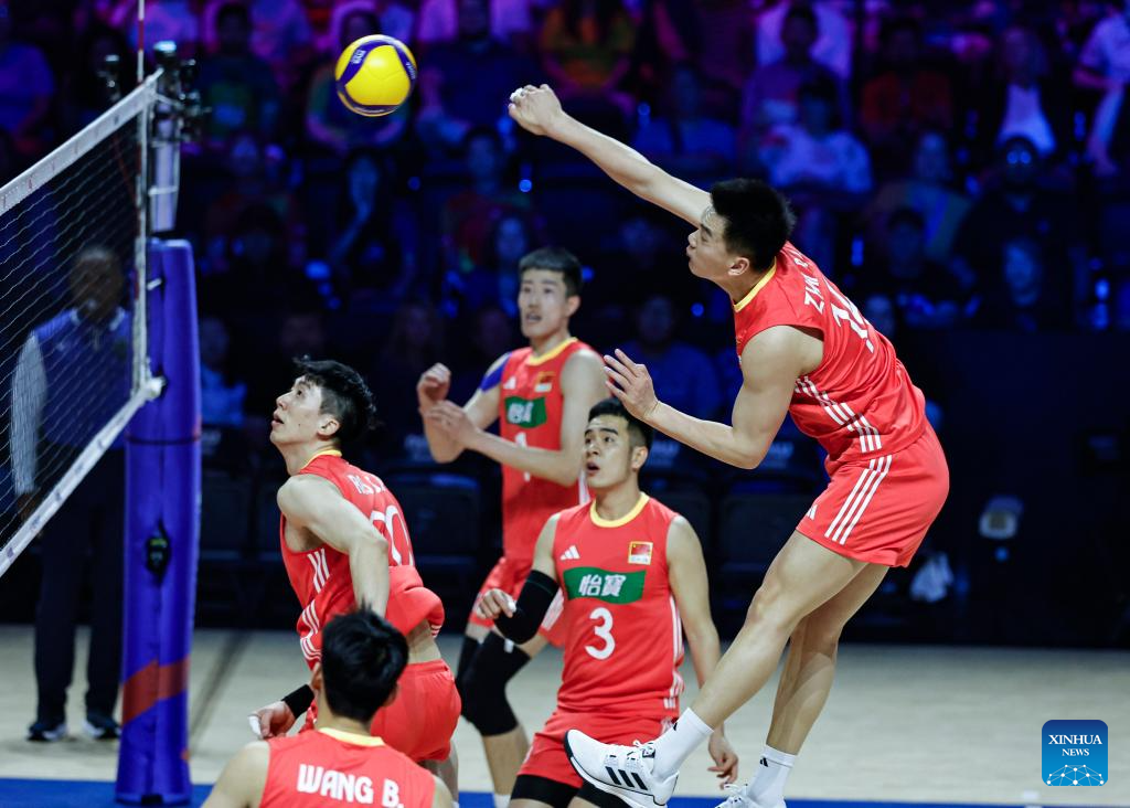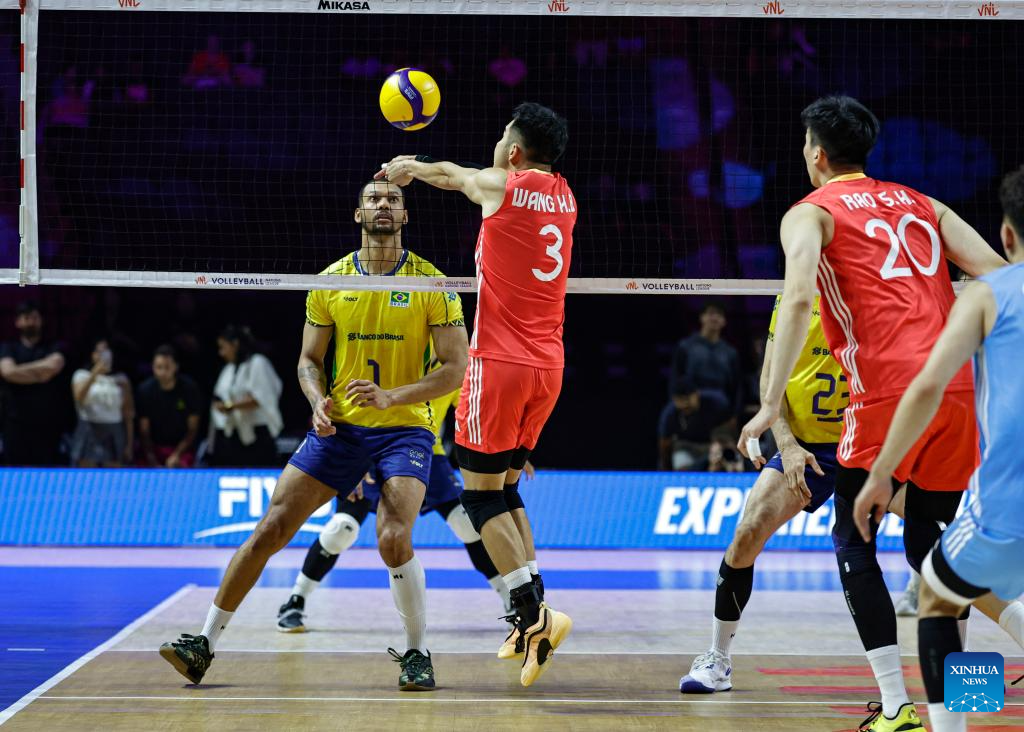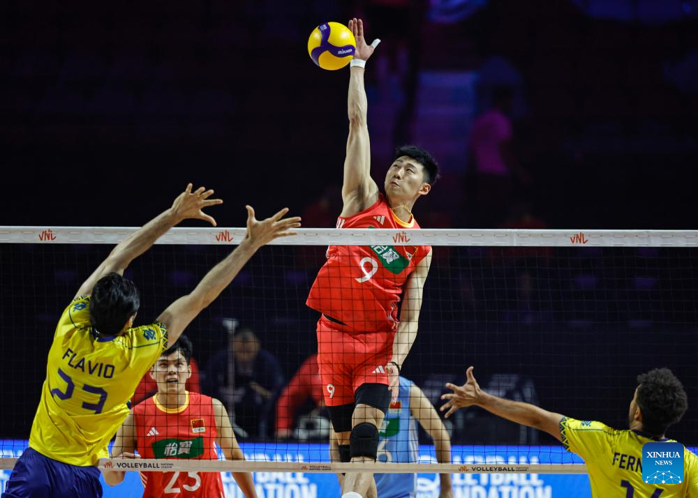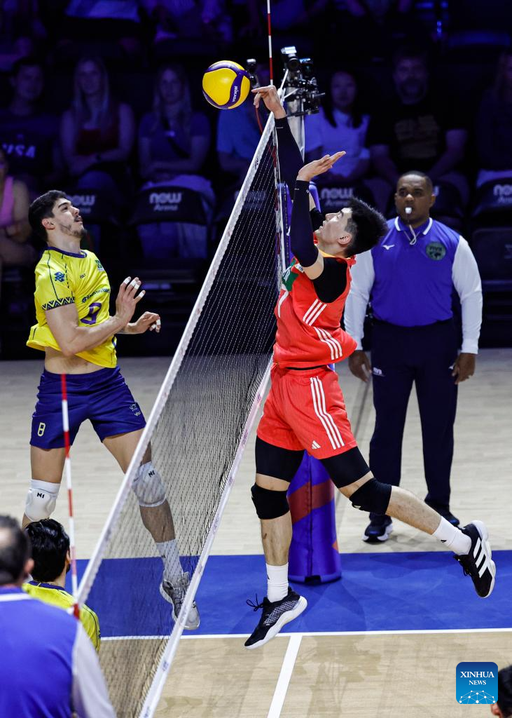 Li Yongzhen (top R) of China spikes the ball during the Pool 5 match between China and Brazil at the Men's Volleyball Nations League (VNL) 2025 in Chicago, the United States, June 26, 2025. (Photo by Joel Lerner/Xinhua)