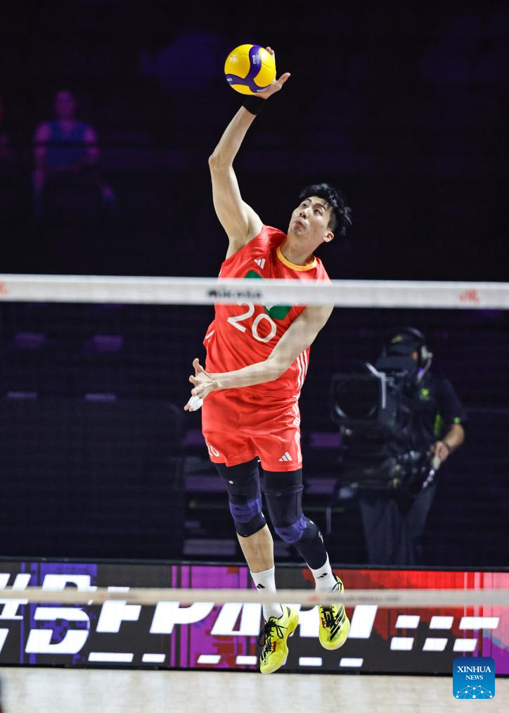 Li Yongzhen of China spikes the ball during the Pool 5 match between China and Brazil at the Men's Volleyball Nations League (VNL) 2025 in Chicago, the United States, June 26, 2025. (Photo by Joel Lerner/Xinhua)