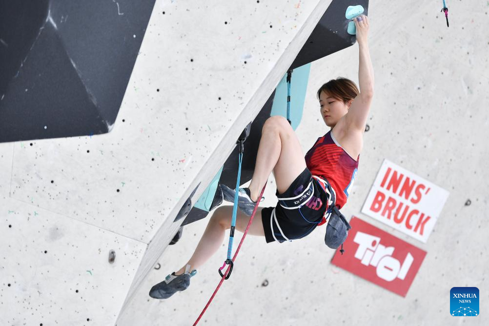 Wei Yali of China competes during the women's lead qualification at the International Federation of Sport Climbing (IFSC) World Cup in Innsbruck, Austria, June 28, 2025. (Xinhua/Lian Yi)