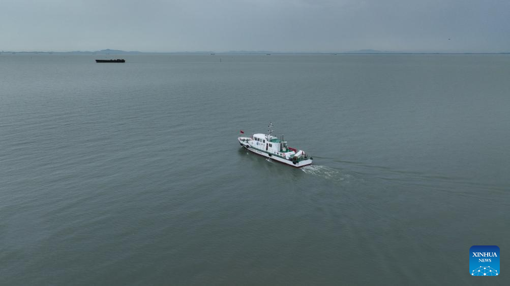 This photo taken on June 28, 2025 shows the pure ammonia-powered demonstration vessel, the "Anhui," making its maiden voyage at the water area of Chaohu Lake in Hefei, east China's Anhui Province. (Xinhua/Zhou Mu)