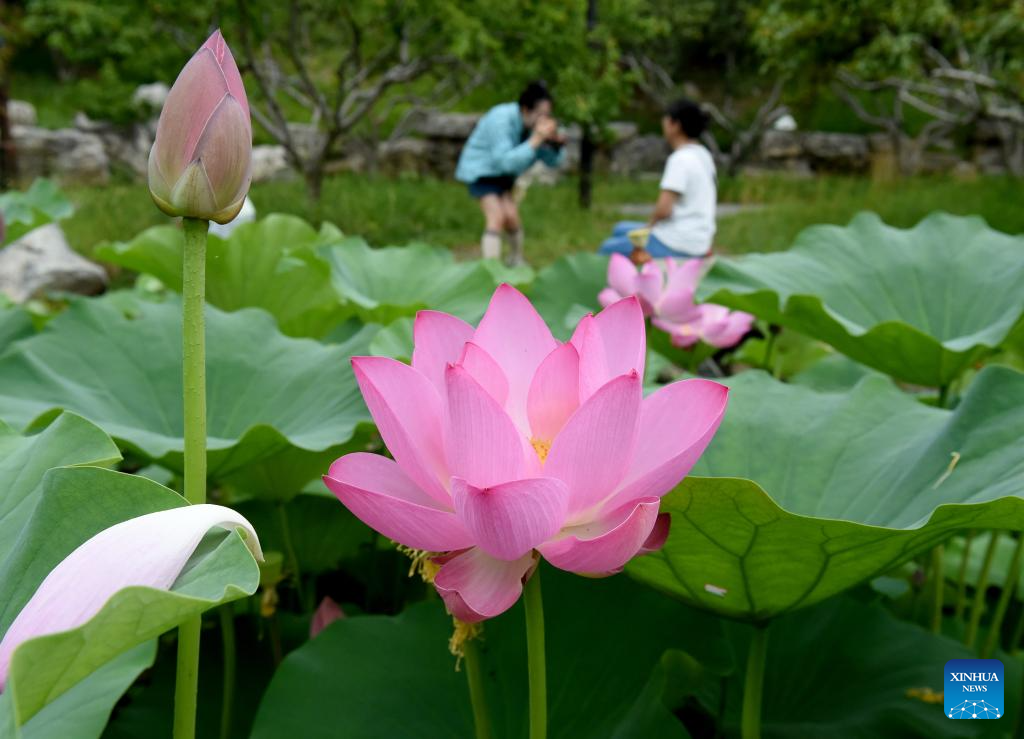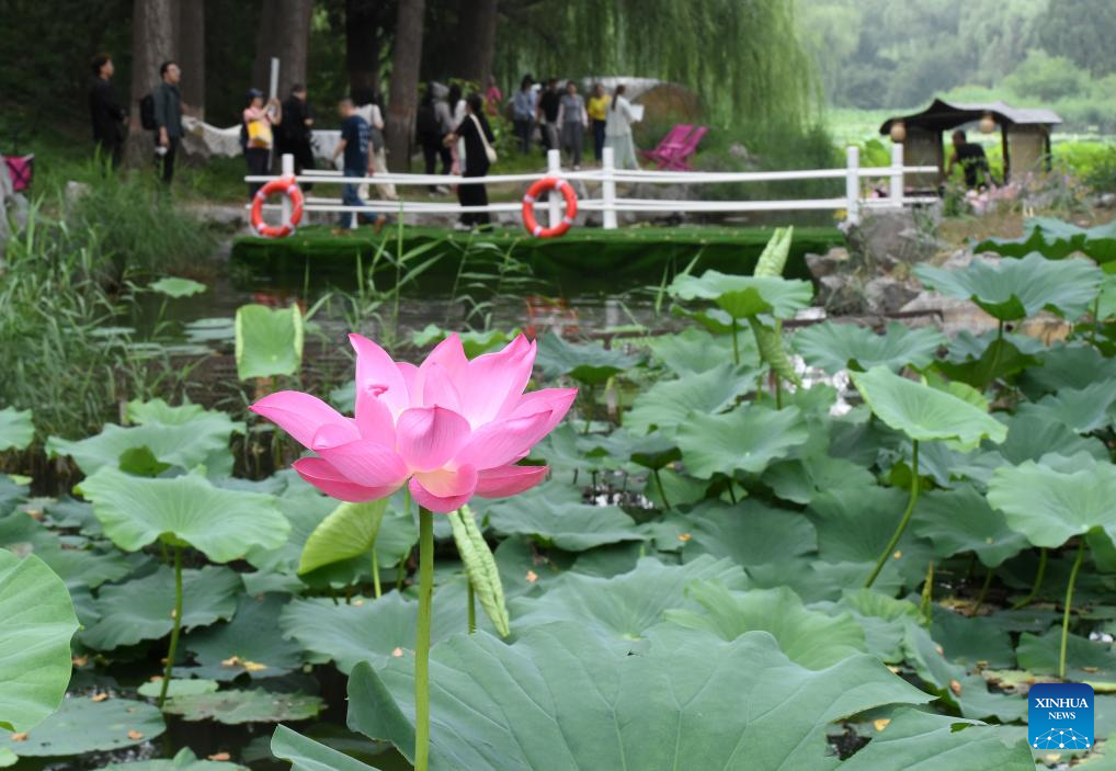 Tourists enjoy lotus flowers during a lotus festival at Yuanmingyuan Park in Beijing, capital of China, June 28, 2025. A lotus festival kicked off in Yuanmingyuan Park on Saturday and will run until Aug. 31. (Xinhua/Luo Xiaoguang)