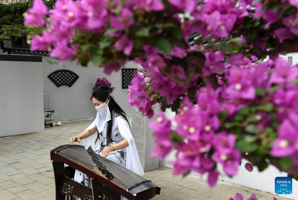 An actress performs at a flower exhibition during a lotus festival at Yuanmingyuan Park in Beijing, capital of China, June 28, 2025. A lotus festival kicked off in Yuanmingyuan Park on Saturday and will run until Aug. 31. (Xinhua/Luo Xiaoguang)