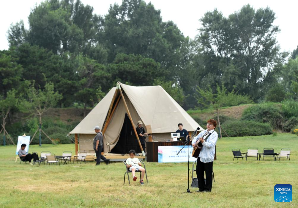 A singer performs near a tent cafe during a lotus festival at Yuanmingyuan Park in Beijing, capital of China, June 28, 2025. A lotus festival kicked off in Yuanmingyuan Park on Saturday and will run until Aug. 31. (Xinhua/Luo Xiaoguang)