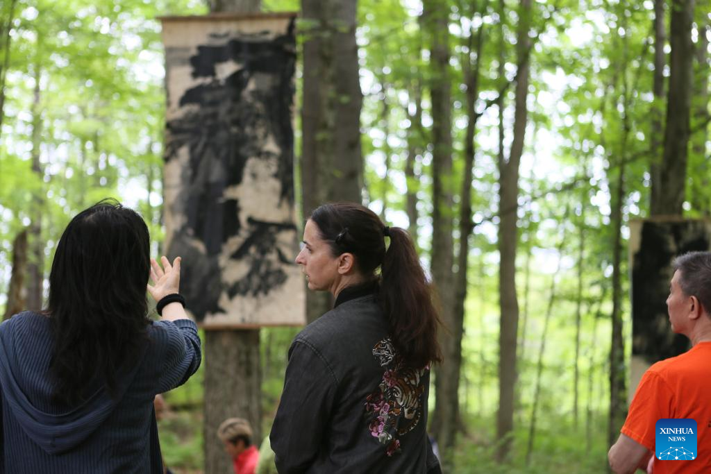Visitors talk in front of a work during an outdoor exhibition "Solar Terms: Contemporary Ink Art Event" in Lenox, Massachusetts, the United States, on June 28, 2025. In a wooded corner of Eastover Estate & Eco-Village, a dozen tall scrolls, roughly a meter wide and three meters high, sway quietly in summer breeze, having been visibly transformed by rain, snow, sunlight and time since they were installed one year ago. The scrolls were painted on rice paper, affixed to durable non-woven fabric, and then framed and suspended between trees in the forest of the U.S. state of Massachusetts. (Xinhua/Zhang Fengguo)
