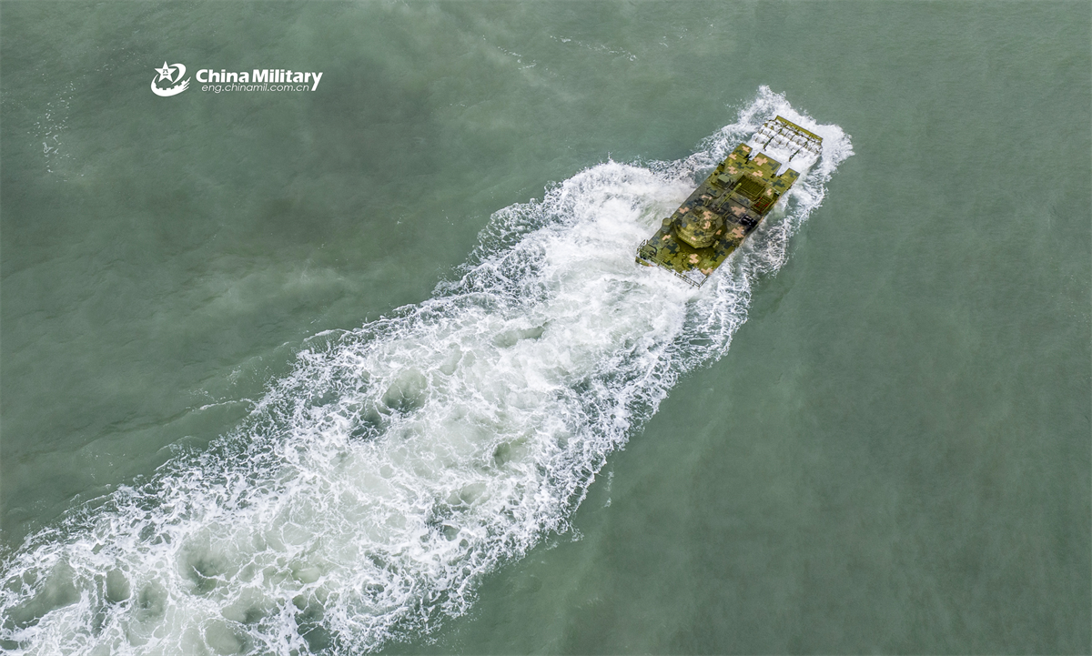 An amphibious infantry fighting vehicle (IFV) attached to the Chinese PLA 74th Group Army steams towards the designated sea area during a maritime driving training exercise on June 13, 2025. (eng.chinamil.com.cn/Photo by Li Bin)