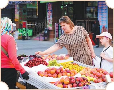 Russian tourists shop along a street in Manzhouli, north China's Inner Mongolia Autonomous Region. (Photo/Wang Huayong)