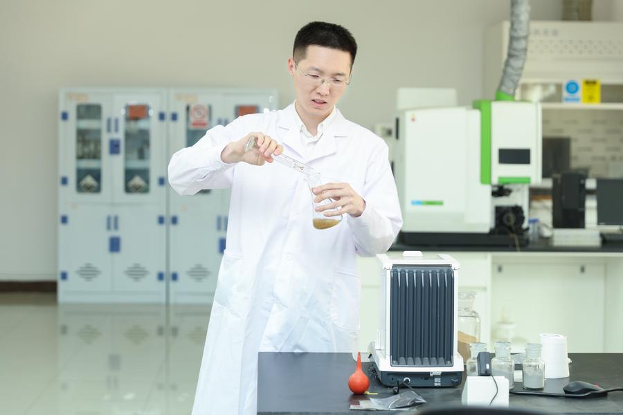 Deng Wenhao, a Communist Party of China member, conducts sample analysis in a laboratory at Taiyuan University of Technology in Taiyuan, north China's Shanxi Province, June 10, 2025. (Xinhua)