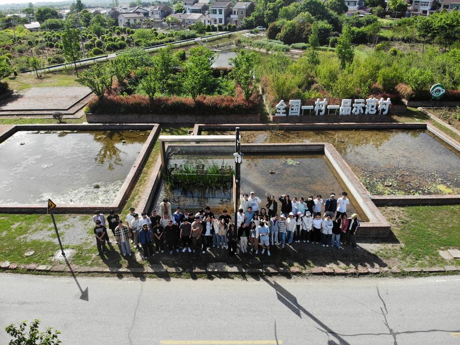 An aerial drone photo taken on April 25, 2025 shows Ling Jiajun taking group photos with his classmates during a field research in Shuijing Village of Jingqiao Town, Lishui District of Nanjing, east China's Jiangsu Province. (Xinhua/Wang Meiqi)