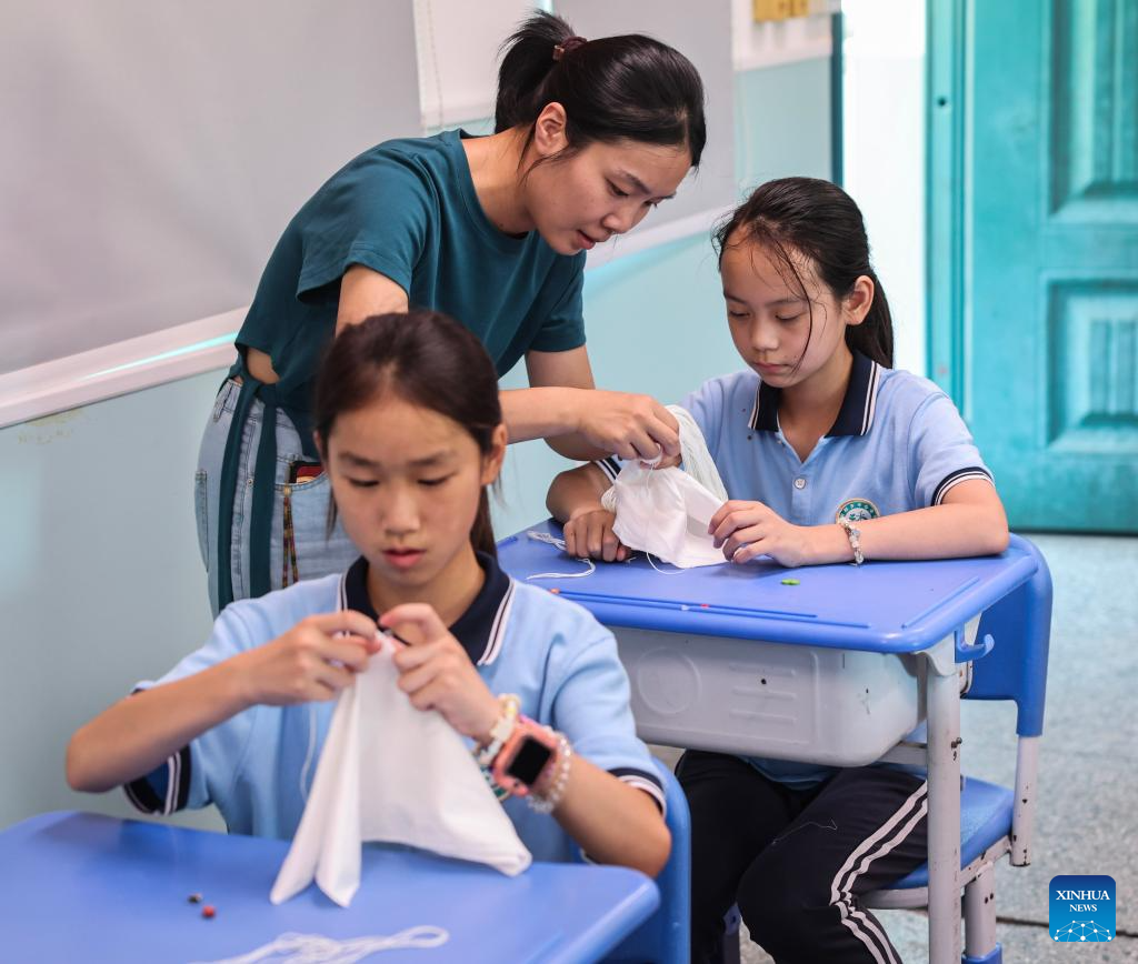 A volunteer teaches children to tie-dye at the Donghe Township central school in Donghe Township, Zhuji City of east China's Zhejiang Province, July 1, 2025. Summer camps themed on cultural promotion have been launched here, to enrich summer vocation activities for local students. (Xinhua/Xu Yu)