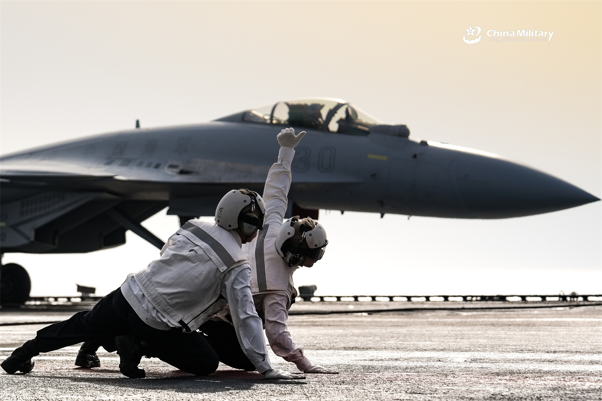 A fighter jet attached to the Navy of Chinese People's Liberation Army (PLA) takes off from the flight deck of an aircraft carrier during a far-sea training exercise. Two Chinese PLA Navy's aircraft carrier task forces, Liaoning (Hull 16) and Shandong (Hull 17), recently completed their combat-oriented far-sea training and safely returned to their home ports. (eng.chinamil.com.cn/Wang Yuanlin)