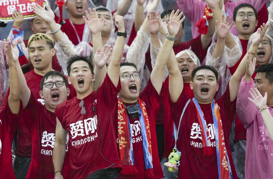 Fans cheer for Changzhou during the fifth-round match against Nanjing at the Su Super League. (Photo/Xinhua)