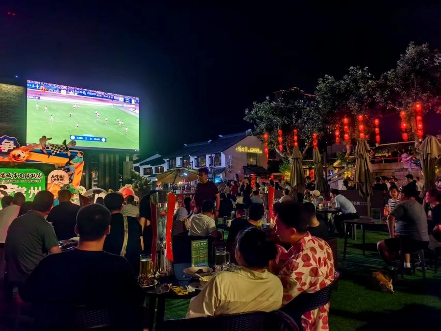 Tourists watch "Su Super League" match in an ancient town scenic area in Wuxi, June 15, 2025. (Handout via Xinhua)