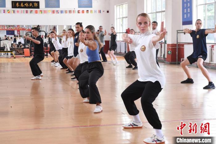 Natalie, a 31-year-old Kung Fu (Chinese martial arts) enthusiast from Switzerland, trains with international classmates in a martial arts school in Yantai, east China's Shandong Province, June 2025. (Photo/Qu Zhengyang)