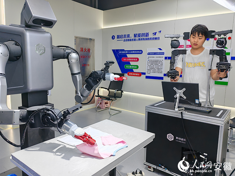 A trainer teaches a robot to fold clothes at an embodied intelligent robot data acquisition pre-training field, dubbed "robot school", in Hefei, capital of east China's Anhui Province. (People's Daily Online/Ding Ji)