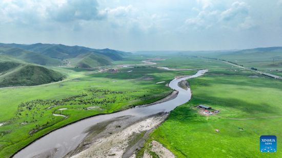 An aerial drone photo taken on July 4, 2025 shows the scenery of the Wulanmaodu pasture in Horqin Right Wing Front Banner, Hinggan League, north China's Inner Mongolia Autonomous Region. In the first half of this year, the banner recorded 2.55 million tourist trips, with total tourism expenditure reaching 882 million yuan (about 123.12 million U.S. dollars). (Xinhua/Bei He)