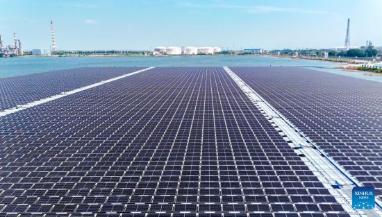 An aerial drone photo taken on July 4, 2025 shows a floating offshore photovoltaic (PV) project of Sinopec Qingdao Refining &Chemical Co., Ltd. in a full-seawater environment in Qingdao, east China's Shandong Province. The project was connected to the grid for electricity generation recently. Located in the Xihai'an (West Coast) New Area of the east China's coastal city, the project innovatively adopts a floating structure, with the photovoltaic panels rising and falling close to the water surface with the tide, and uses seawater to efficiently dissipate heat to improve power generation efficiency. With an installed capacity of 7.5 megawatts, it is expected to generate nearly 10 million kilowatt-hours of green electricity annually and reduce carbon dioxide emissions by 8,300 tons. Since it was put into use on July 1, the project has generated a total of 123,100 kilowatt-hours of electricity. (Photo by Zhang Jingang/Xinhua)