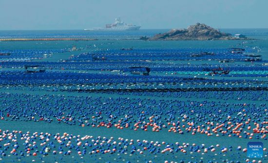 This photo taken on July 3, 2025 shows a marine ranch in Lianjiang County of Fuzhou, southeast China's Fujian Province. Leveraging its unique marine resources, distinctive fisheries industry, and regional economic advantages, Lianjiang County has in recent years been promoting the upgrade and intelligent transformation of deep-sea and far-sea mariculture platforms, and developing the farming of aquatic products such as kelp, large yellow croaker, and abalone.