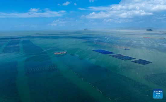An aerial drone photo taken on July 3, 2025 shows a marine ranch in Lianjiang County of Fuzhou, southeast China's Fujian Province. Leveraging its unique marine resources, distinctive fisheries industry, and regional economic advantages, Lianjiang County has in recent years been promoting the upgrade and intelligent transformation of deep-sea and far-sea mariculture platforms, and developing the farming of aquatic products such as kelp, large yellow croaker, and abalone.