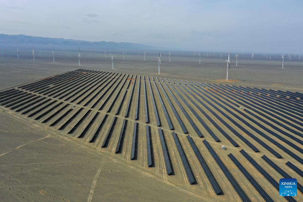 An aerial drone photo taken on March 23, 2025 shows a solar power station of the Hami-Chongqing ±800 kV ultra-high voltage direct current power transmission project in Hami, northwest China's Xinjiang Uygur Autonomous Region. (Xinhua/Ding Lei)