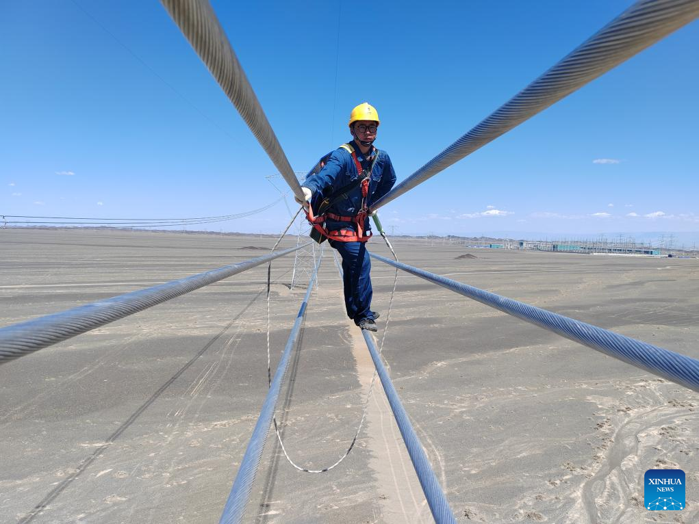 A staff member checks the cables of the Hami-Chongqing ±800 kV ultra-high voltage direct current power transmission project in northwest China's Xinjiang Uygur Autonomous Region, June 19, 2025. (Photo by Du Jinming/Xinhua)