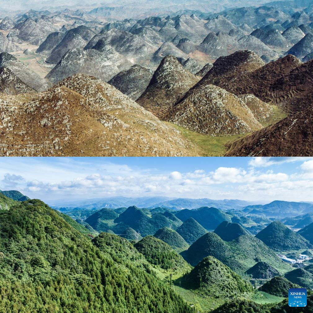 This combo photo shows the views of Meihua Mountain in Liupanshui, southwest China's Guizhou Province, in April 1996 (above, photo by Jiang Xingyuan) and on July 4, 2025 (below, photo by Xinhua photographer Tao Liang). In recent years, Guizhou has made significant progress in ecological construction, striving to transform ecological advantages into developmental strengths.