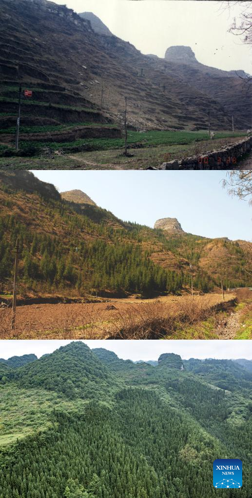This combo photo shows the view of a sloped farmland in Chuanyan Village of Dafang County in Bijie, southwest China's Guizhou Province, before reforestation project (above, file photo provided by Dafang County forestry bureau), during reforestation project (middle, photo taken on March 14, 2009, provided by Dafang County forestry bureau), and on June 2, 2022 (below, photo by Xinhua photographer Tao Liang). In recent years, Guizhou has made significant progress in ecological construction, striving to transform ecological advantages into developmental strengths.