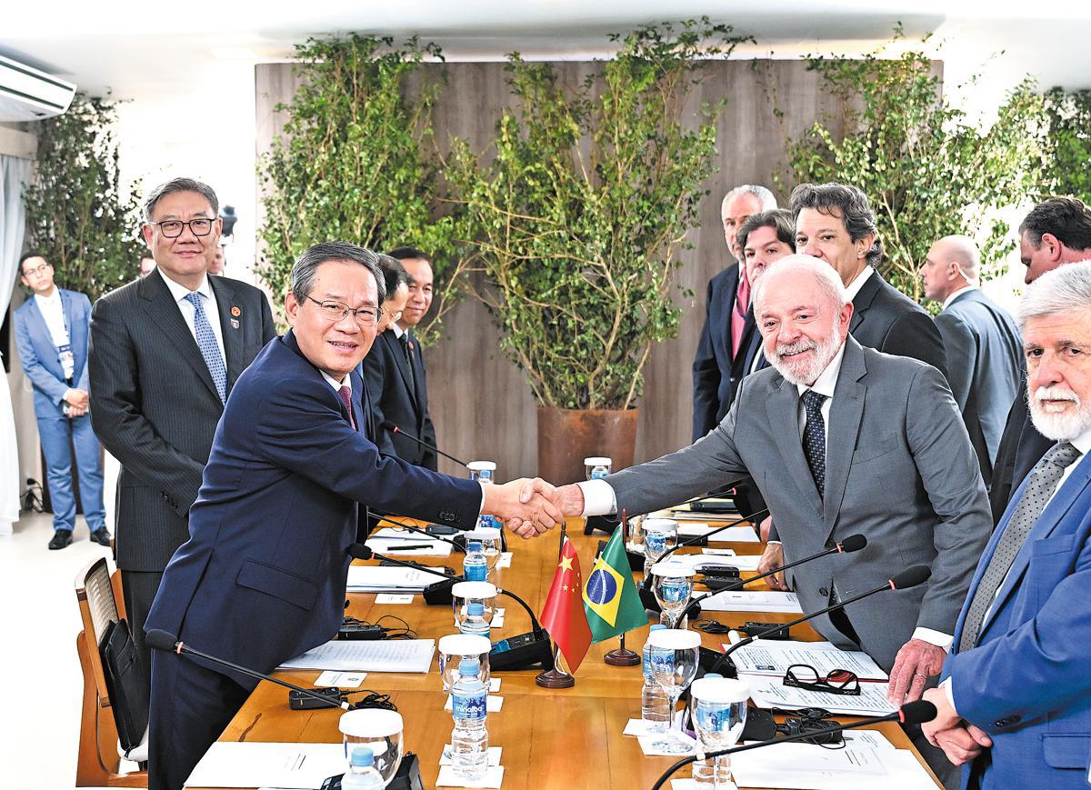 Premier Li Qiang shakes hands with Brazilian President Luiz Inacio Lula da Silva during their meeting in Rio de Janeiro,Brazil, on Saturday. LI XIANG / XINHUA