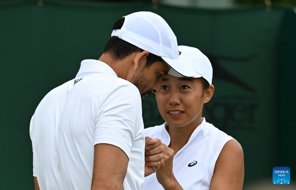 Zhang Shuai (L)/Marcelo Arevalo compete during the mixed doubles first round match between Zhang Shuai of China/Marcelo Arevalo of El Salvador and Chan Hao-Ching of Chinese Taipei/Andre Goransson of Sweden at the Wimbledon Tennis Championships in London, Britain, July 5, 2025. (Xinhua/Zhao Dingzhe)
