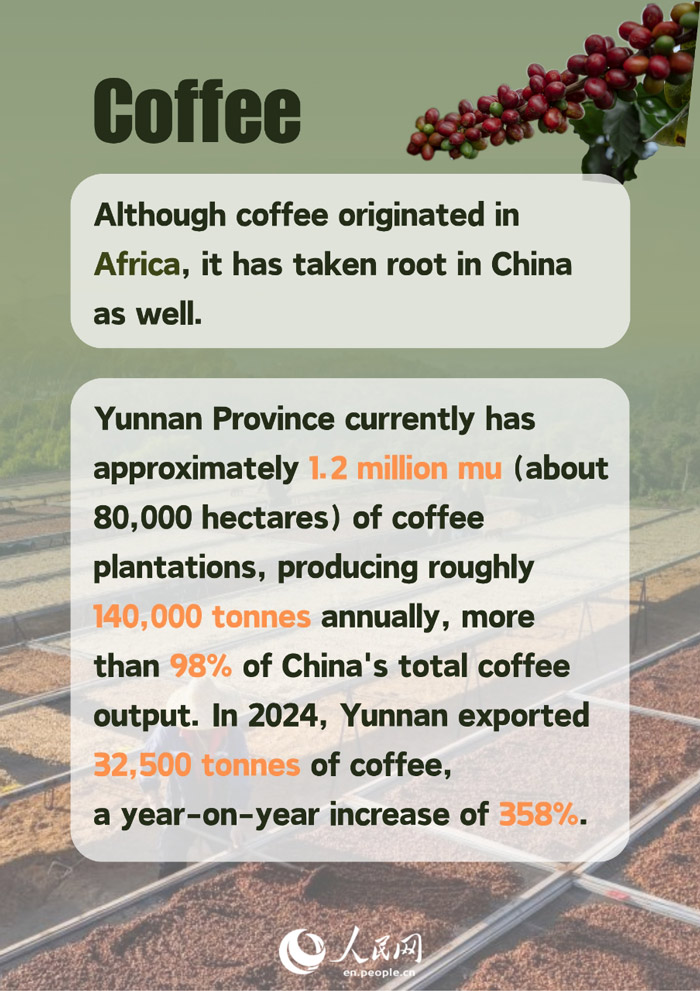 According to the Yunnan Provincial Department of Agriculture and Rural Affairs, the province currently has approximately 1.2 million mu (about 80,000 hectares) of coffee plantations, producing roughly 140,000 tonnes annually, more than 98 percent of China's total coffee output.