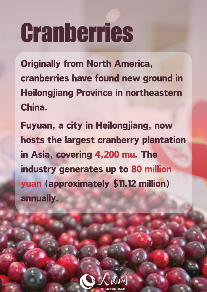 Fuyuan, a city in Heilongjiang, now hosts the largest cranberry plantation in Asia, covering 4,200 mu. The industry generates up to 80 million yuan (approximately $11.12 million) annually. Over the past five years, local farmers have received more than 4 million yuan in dividends, with over 1,000 jobs created each year.