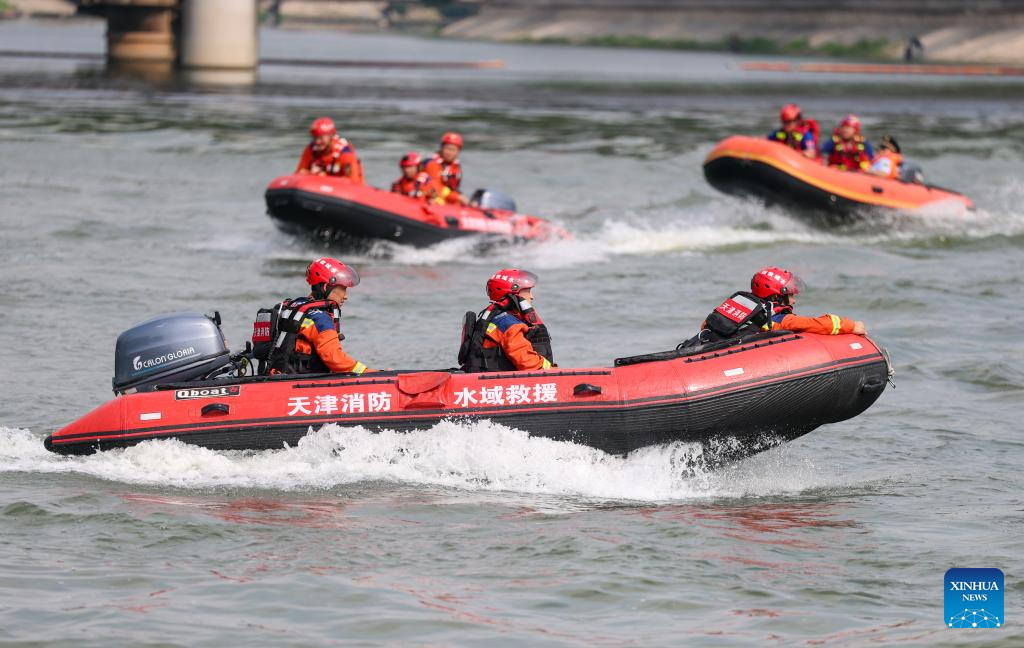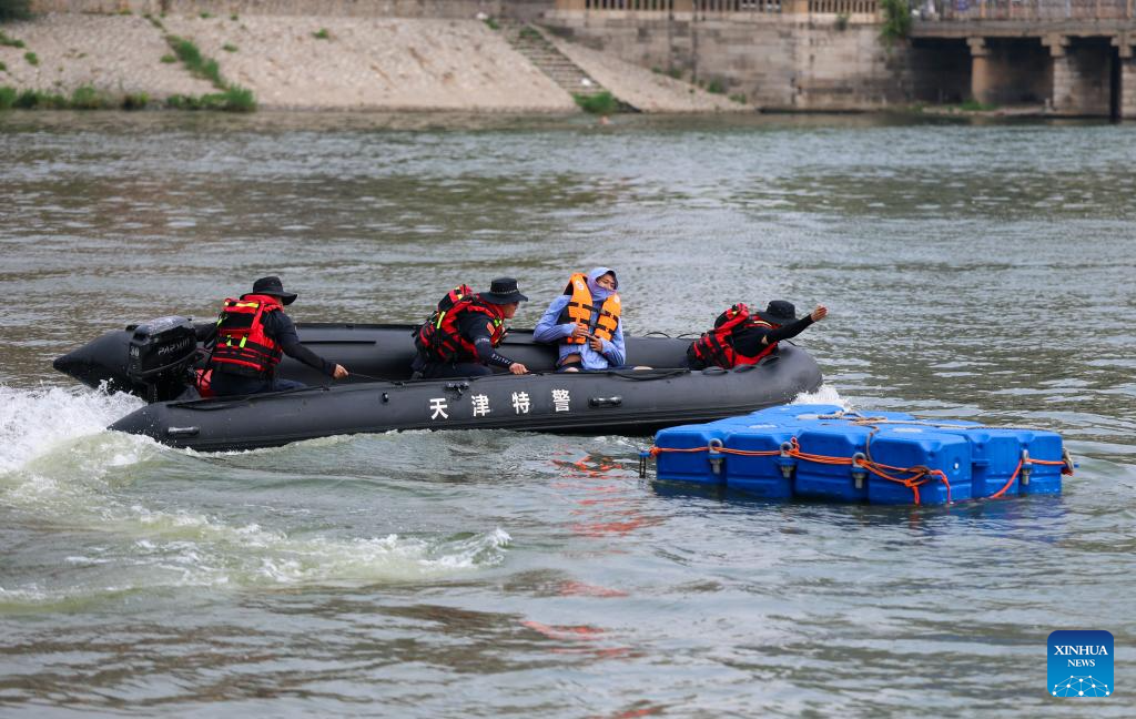 Rescuers participate in a flood rescue drill on Haihe River in north China's Tianjin, on July 5, 2025. The drill was set against potential flooding in culverts and low-lying urban areas affected by heavy rainfall. (Xinhua/Sun Fanyue)