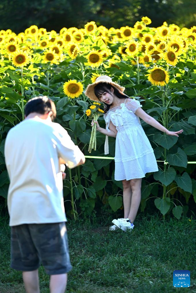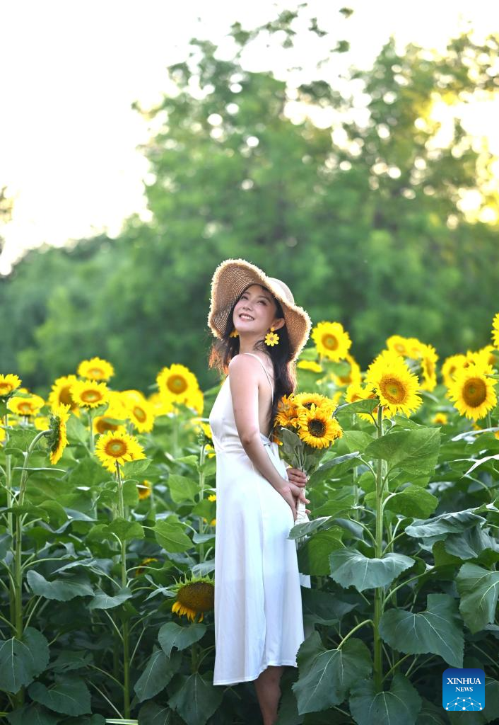 A tourist poses for photos with sunflowers at the Olympic Forest Park in Beijing, capital of China, July 5, 2025. The sunflowers here entered blooming season, attracting a good many tourists. (Xinhua/Chen Yehua)
