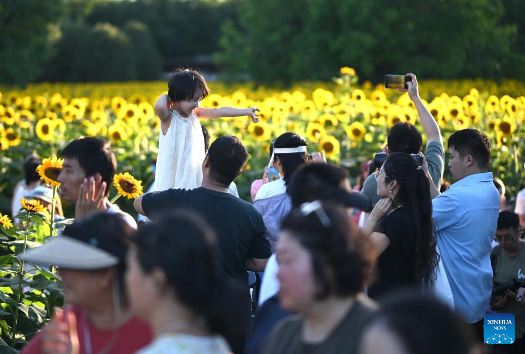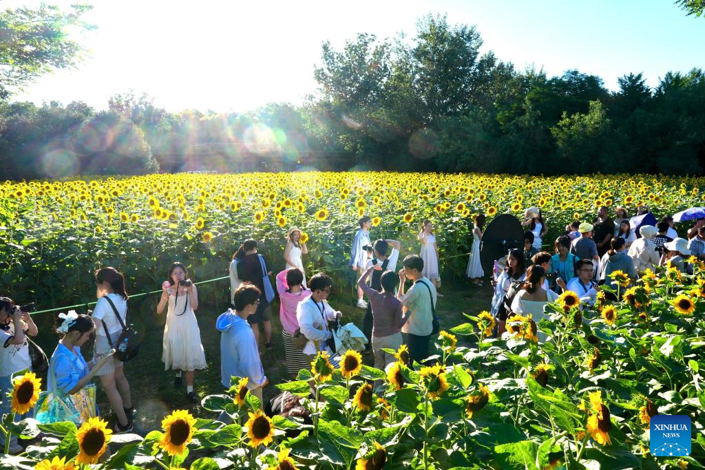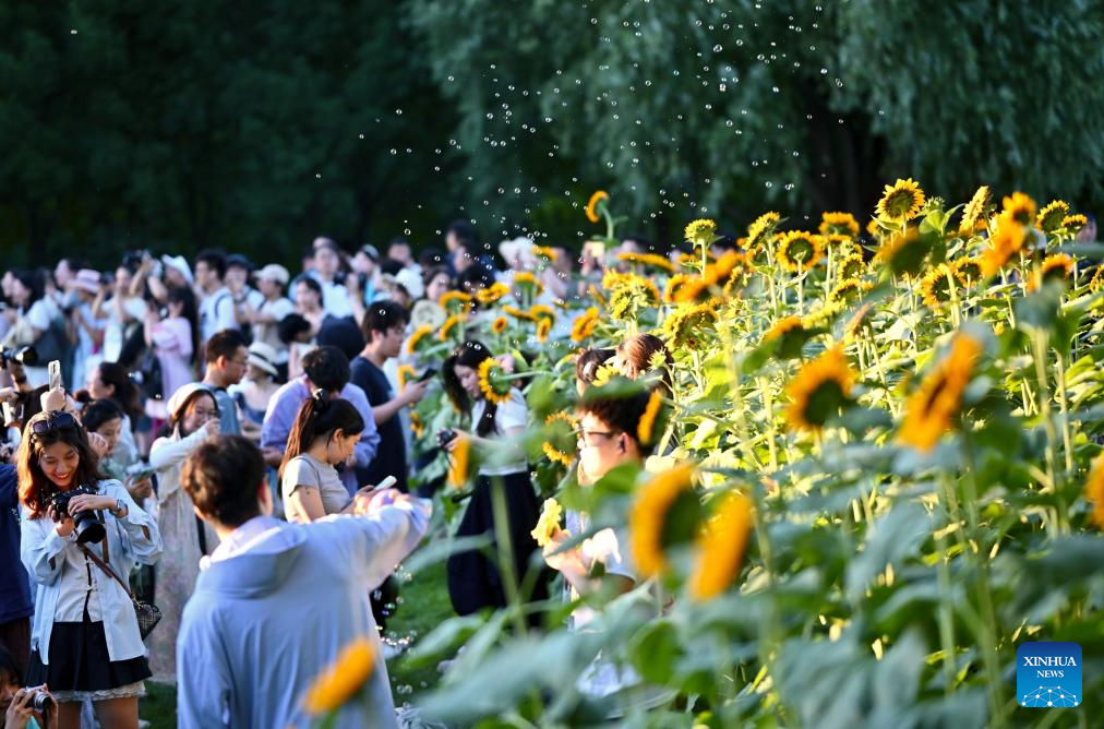 Tourists visit a sunflower field at the Olympic Forest Park in Beijing, capital of China, July 5, 2025. The sunflowers here entered blooming season, attracting a good many tourists. (Xinhua/Chen Yehua)