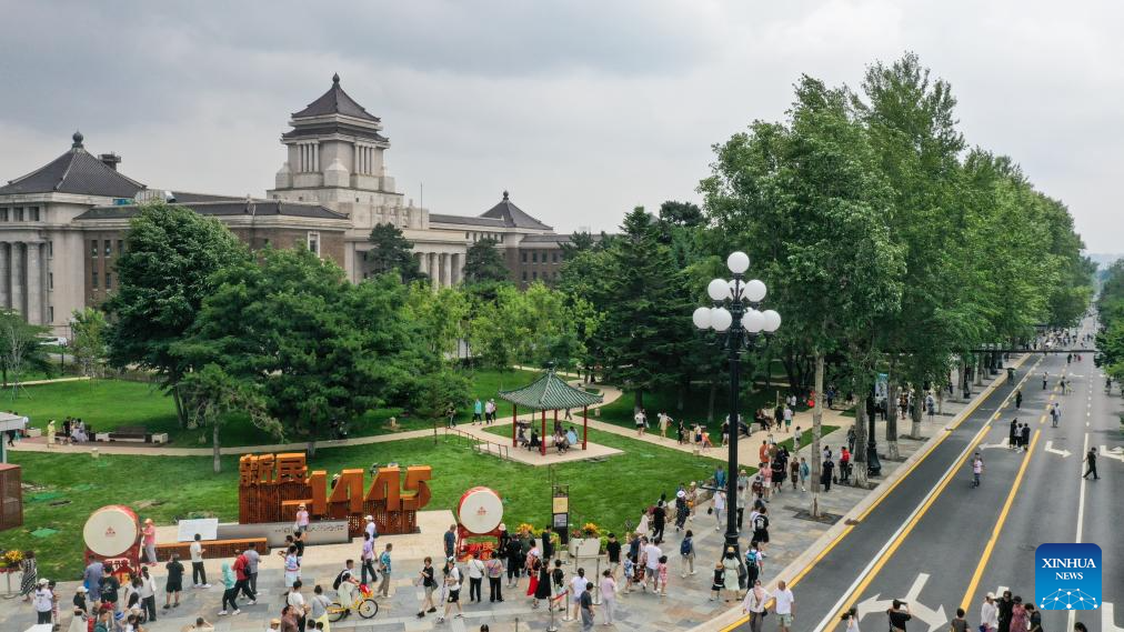 An aerial drone photo taken on July 5, 2025 shows visitors on Xinmin Street in Changchun, northeast China's Jilin Province. Xinmin Street, a historical and cultural street in Changchun of Jilin Province, officially opened to the public on Saturday following renovation.
