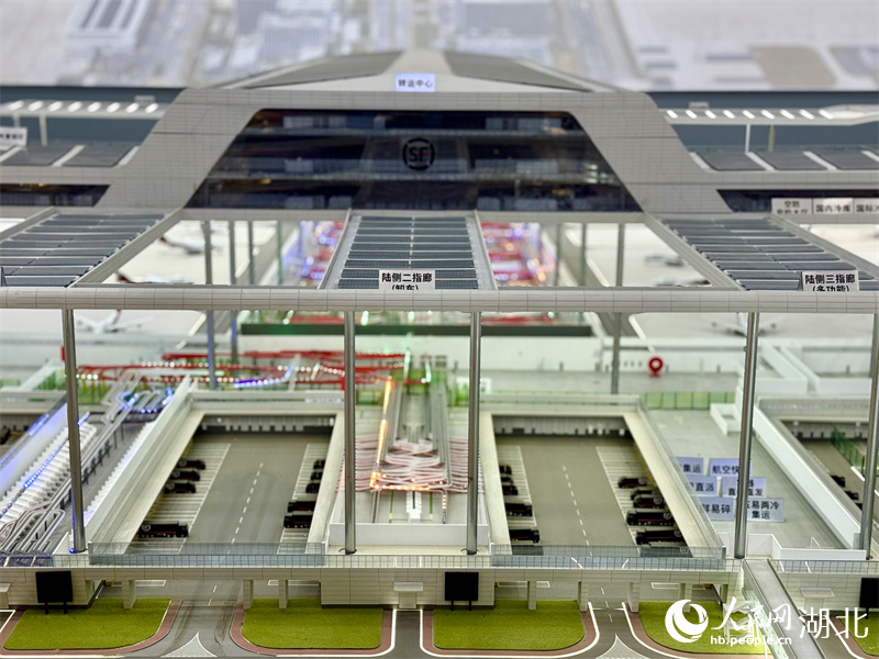 Photo shows a sand table of the cargo transfer center of the Ezhou Huahu International Airport in Ezhou city, central China's Hubei Province. (People's Daily Online/Zhou Tian)