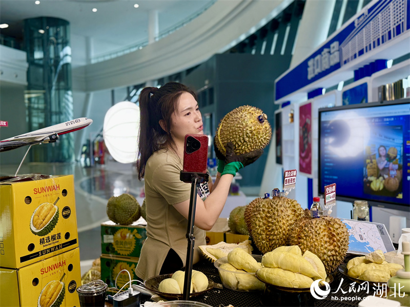 A livestreamer promotes durians from Thailand at the cross-border e-commerce industrial park in Ezhou city, central China's Hubei Province. (People's Daily Online/Zhou Tian)