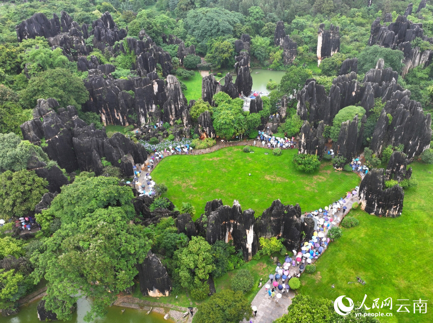 Photo shows tourists strolling under umbrellas in the Stone Forest Scenic Area in Kunming, southwest China's Yunnan Province. (People's Daily Online/Yin Xin)